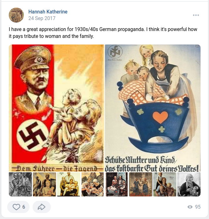 If there was any question as to her true ideology, a look at her Twitter and VK accounts revealed Hitler and Nazi propaganda.