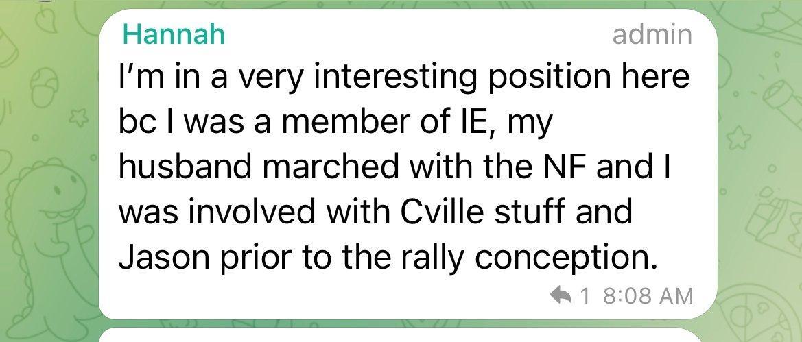 Both Hannah and Andrew were in numerous white nationalist groups. Hannah indicated her own involvement in Identity Evropa and Identity Dixie in messages and images, and mentioned that Andrew marched with the neo-Nazi Nationalist Front.